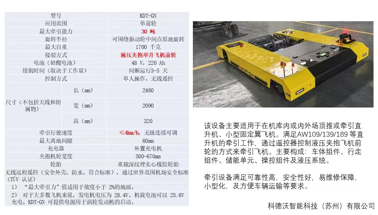 KDT-GN无线遥控飞机牵引车是科德沃智能科技(苏州)有限公司在国内研发生产的符合中国市场的一款小型飞机牵引车,无线遥控式飞机牵引车目前在全球得道了广泛的应用和广大用户的喜爱。科德沃为满足中国市场飞机地面保障用户对小型化设备的技术性能与操作维护性等方面的综合要求,研发了该型设备,其主要部件、驱动电机、控制器、电池、操控系统均为原装进口,其借鉴了国外诸多品牌飞机牵引车的优越特性,更加可靠安全的运行并直接降低飞行前机务人员的体力输出,且只需要极低的运营成本。